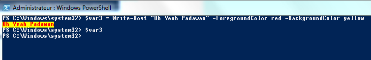 PS >$var3 = Write-Host \"Oh Yeah Padawan\" -ForegroundColor red -BackgroundColor yellow