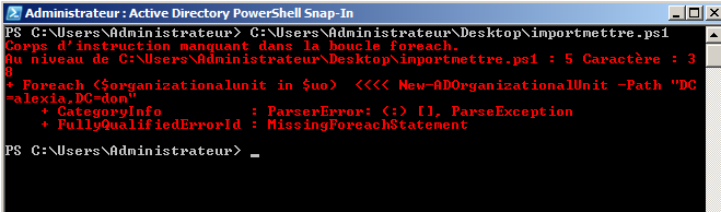 Au niveau de C:\Users\Administrateur\Desktop\import.ps1 : 2 Caractère : 90